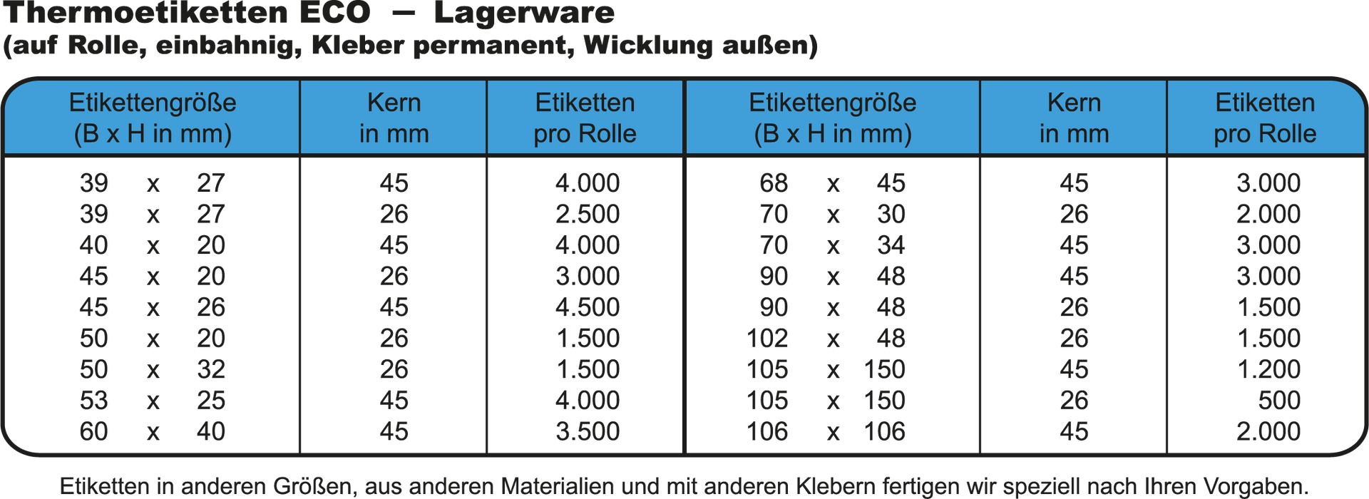 In der folgenden Tabelle erhalten Sie einen Überblick über kurzfristig lieferbare Thermoetiketten aus unserem Standardsortiment.